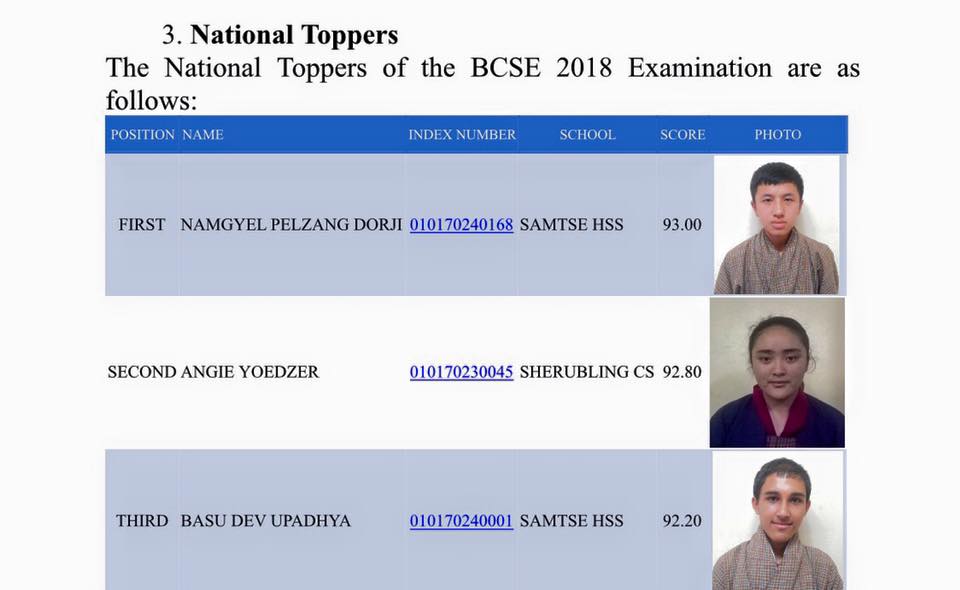 Namgyel Pelzang Dorji of Samtse High School topped the board with 93 per cent while Angie Yoedzer of Sherubling Central school with 92.80 per cent came second. Basu Dev Upadhya of Samtse High School scoring 92.20 percent came third.