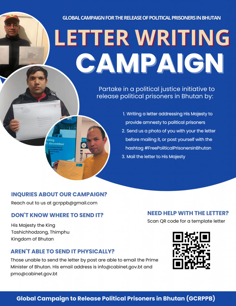 Global Campaign for the Release of Political Prisoners in Bhutan (GCRPPB) has successfully concluded a 15-day mass letter-writing campaign that started on 1 February 2023 and ended on 15 February 2023.