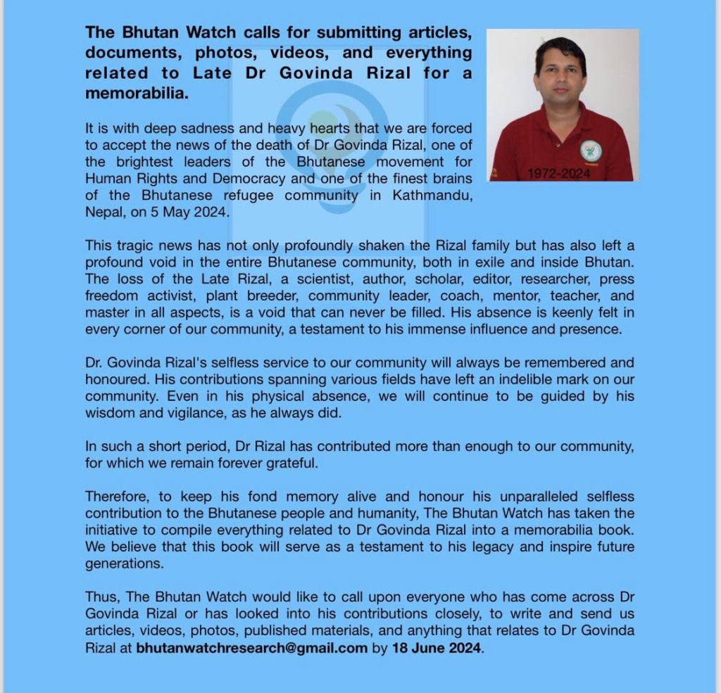This notice follows up on The Bhutan Watch’s call on 9 May 2024 (attached for your reference) for contributions of articles, photos, videos, and every document or write-up connected with the late Dr Govinda Rizal to compile memorabilia. Your contributions are invaluable to us.